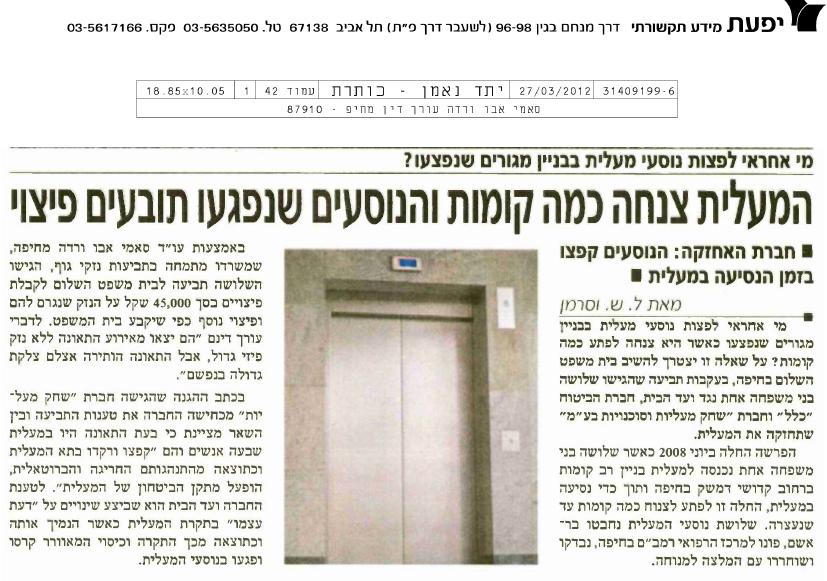 בעקבות תביעה שהגישו שלושה בני משפחה אחת נגד ועד הבית, חברת הביטוח “כלל” וחברת “שחק מעליות וסוכנויות בע”מ” שתחזקה את המעלית. יצטרך להחליט בית משפט השלום בחיפה מי אחראי על תשלום הפיצוי?